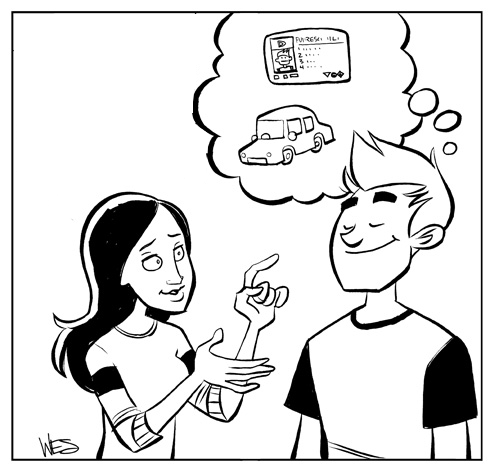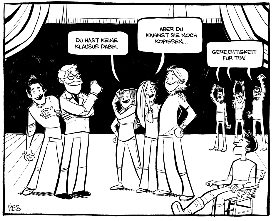 Der Cartoon spielt auf die Geschichte von Steffen an, der nach einer "riesen Dummheit" zu seinem schärfsten Richter wird. In der Beratung entwickelt er eine Lösung, welche ihm wieder mehr Lebensfreude gestattet und den Zugriff auf seine positiven Fähigkeiten wieder stärker ermöglicht. "Der Haushaltsstreit mit dem Minister für Spaß und Vergnügen" stellt eine Variante vor, mit der Schüler sich selbst coachen können.