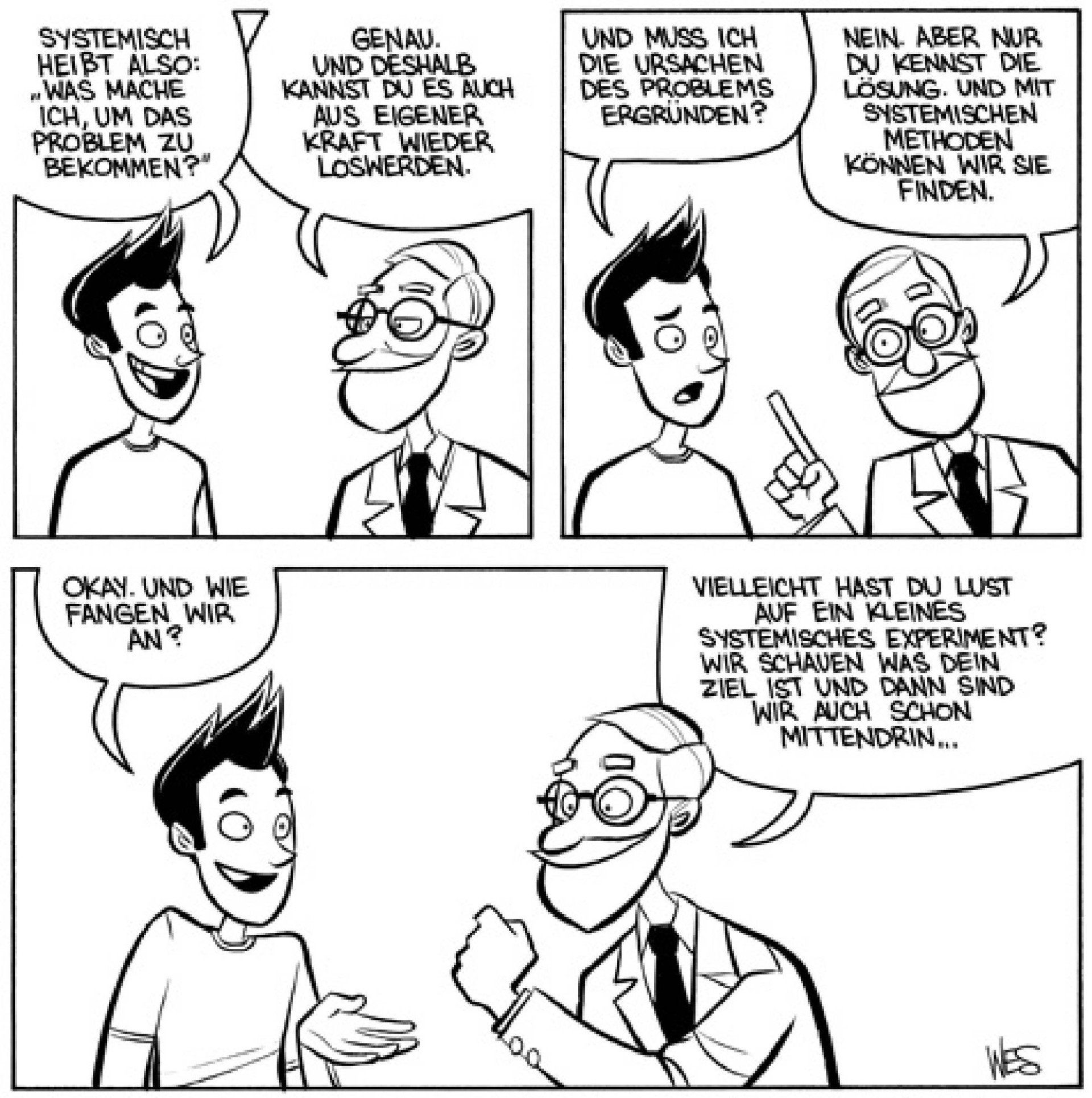 Der Einstiegscartoon deutet bereits die systemische Haltung und den typischen Beratungseinstieg an. Als systemischer Berater versuche ich herauszufinden, wie der Schüler das Problem konstruiert. Eine Besonderheit dieses Ansatzes ist vielleicht das Vertrauen darauf, das nur der Schüler weiß, wie sein Problem gelöst werden kann, und dass er die Lösungen bereits in sich trägt.